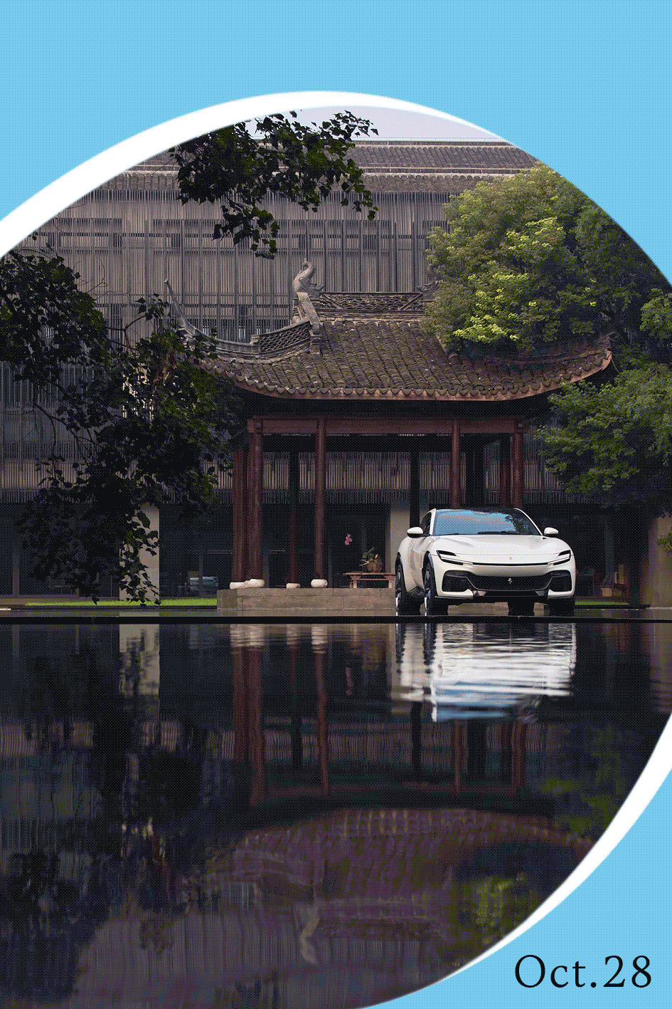 在江南水乡的西塘,白墙灰瓦雨如烟,古意石桥月半弯。法拉利Purosangue昂扬驶来,为恬静淡雅的江南画卷落下澎湃动感的一笔。