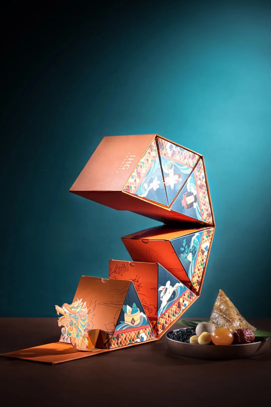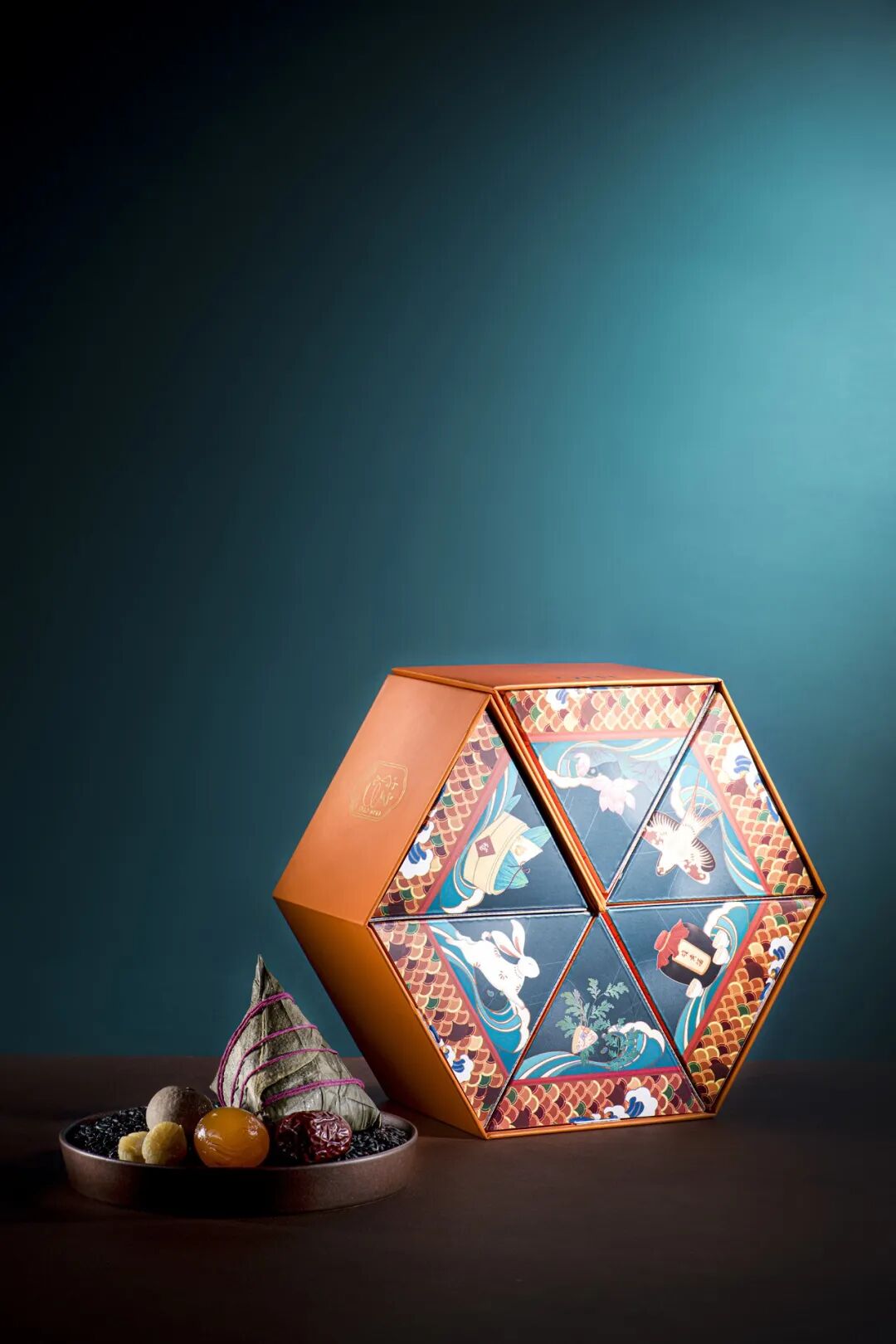 礼盒设计方面也相当用心,融合了现代理念与传统文化,如“洲”聚端午礼盒聚拢时呈六边形,代表六顺六合,展开时则会变成象征破浪前行的“一尾龙舟”;“洲”享端午礼盒以古代建筑为灵感,亮橙色顶盖及弧形把手设计更添轻松实用功能;“洲”尚端午礼盒设计灵感则来自江南宅院,顶部的屋檐巧妙化身为礼盒提手,与金属质感的环形抽屉门扣相呼应,彰显时尚大气。满满美好寓意,自留送人皆宜。