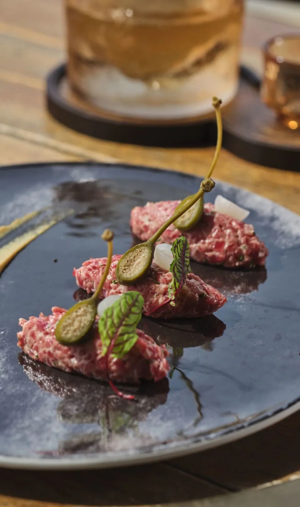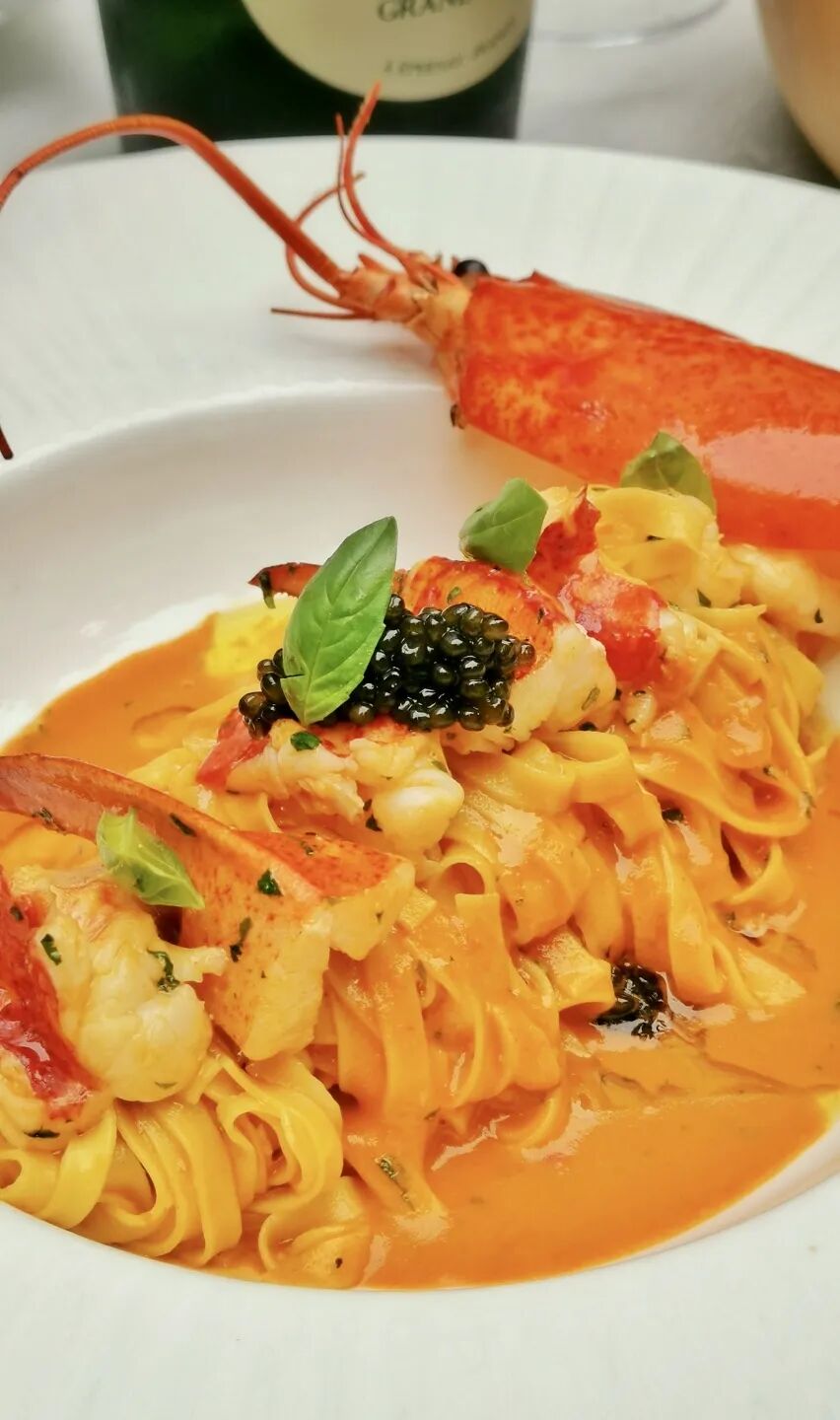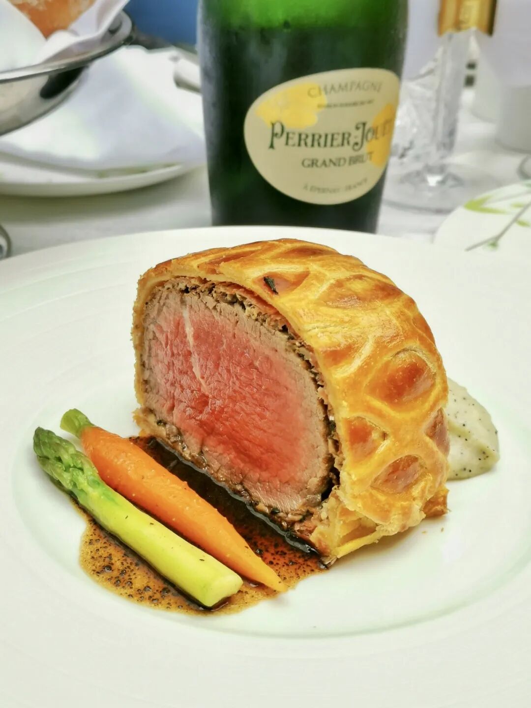 菜单为五道式任选菜单。其中烟熏三文鱼选用鲜美丰腴的三文鱼鱼腩部位加以烟熏,树枝中的植物油脂化成微小颗粒附着在鱼肉上,随着时间的流逝慢慢渗透,鱼肉、盐、烟的巧妙平衡将口感和风味推向高潮。惠灵顿牛排选用细腻多汁的菲力牛排,精选蘑菇酱和帕尔马火腿,包裹上起酥面皮,烤制后与牛肉搭配的口感令人满足。波士顿龙虾面采用手工自制意式细面,精选波士顿龙虾尾肉,通过精心腌制和低温浸泡的加工方法,让龙虾肉爽口弹牙,意面也筋道充满韧性。各色佳肴皆和三小时畅饮的Perrier-Jouët Grand Brut香槟完美融合,其酒体适中,烟熏味搭配烤坚果香融合淡蜂蜜,即为成熟黄色水果浓郁香气的点睛之笔。