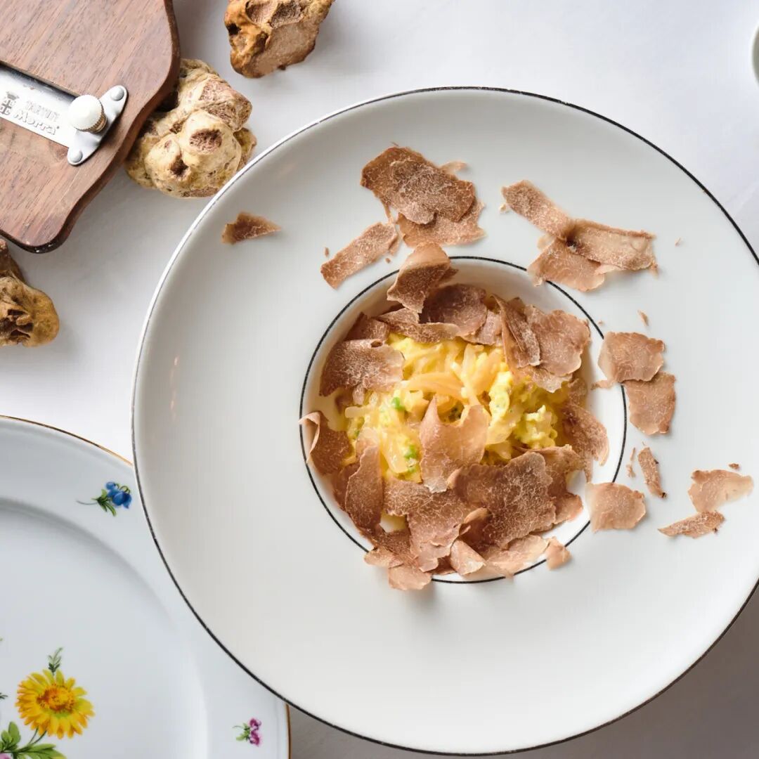 蔡昊:我们这一季的主打菜“白松露啫喱蛋”,新鲜的阿尔巴白松露,配合我们主体上的土家鸡蛋加发完后切丝的花胶。花胶跟鸡蛋像炒牛奶蛋一样快炒,炒得像蛋液浆的一样,因为有花胶的胶质在里面,所以浆看起来很丰裕,同时还有点流动状,炒后上很烫的碟,趁着这时的温度去客人面前刨上白松露,白松露的煤气香味会瞬间上来,一口下去有蛋、有花胶,简单但非常好吃,也有中国文化的传承在里面,很多顾客非常喜欢。