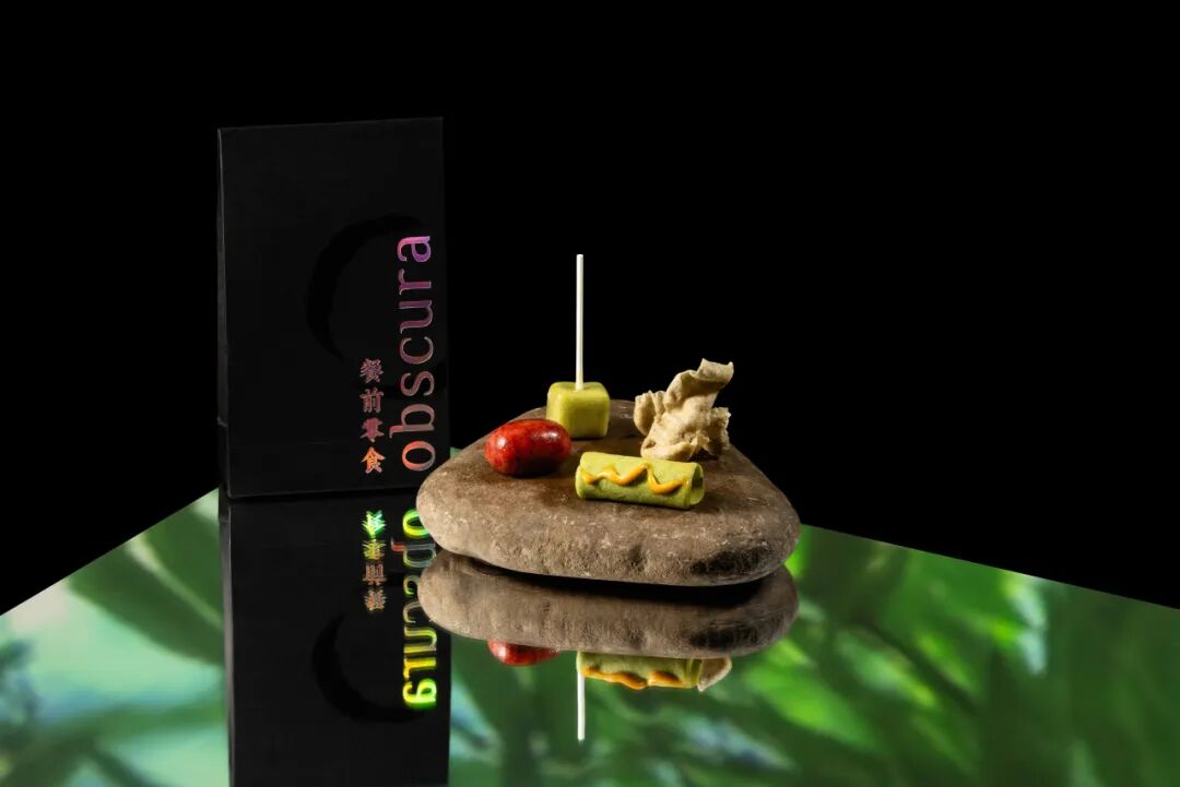 我们专门为长大的他们准备了4款小零食,有棉花糖造型的,有像虾片造型的,有像便利店可以买到的小红肠,还有一款蛋卷饼干。虽然看起来像零食,但我们将这些风味做成了年轻活泼的概念,味型上我们用了一个非常古老的概念,就是中国用发酵工艺处理过的食品。中国的发酵食物非常博大精深,我很喜欢这些发酵食物。而且发现中国的发酵食物很多都是围绕酸、香、臭这四个味型,于是采用了这个特点制作了四道小食。我们很热衷于寻找有像发酵食物这样特色的中国味道,并且融入到我们的菜品中,把中国美食的丰富性展现给更多的食客。