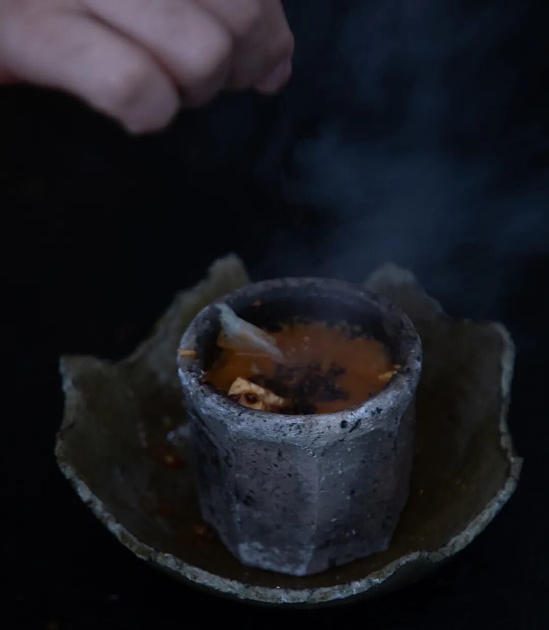 蔡昊:潮汕人睁眼就喝茶,睡觉前也喝茶。潮汕人喝茶还是以乌龙体系为主,包括铁观音跟单丛这一类的。我更喜欢单丛,我在家乡的一块山上有一块试验田,就种单丛茶,专门送给来我们餐厅消费的客人用的茶,量不大。我们这几年也在研发茶产品,包括冷萃茶粉,这刚好切中你在飞机上、火车上要喝一杯原汁原味的茶的痛点,在一瓶矿泉水里倒一包茶粉,茶粉瞬间还原单丛到95%以上,且在冷水里的表达就很好。“蔡昊精选”现在大概有四个茶叶品类,面对不同的情景都可以应对。比较特别的还有气泡茶和挂耳杯。因为看到很多不喝酒的人,或是一些职业是不允许喝酒的人,在吃饭时也想有点仪式感,聚会时能替代喝酒那种感觉的,那就打开一瓶气泡茶,注入香槟杯,因为相对来说有比较冰凉的温度,所以感觉更像是打开一瓶香槟,喝的时候会有干杯的仪式感,同时它在配餐里也起到一定的作用,单丛和正山小种可以分别搭配不同的食物,起到了很好的效果,所以它也由侍酒师来服务,而不是茶艺师。至于挂耳杯,我们把原液磨成细片,然后就像挂耳咖啡一样手冲,用100度的水冲300毫升,之后就喝这一杯,这也是现在年轻人比较喜欢的。我们刚开始在设定这个产品时的初衷,就是让外国人眼里的中国茶多一个表达的方式出来。