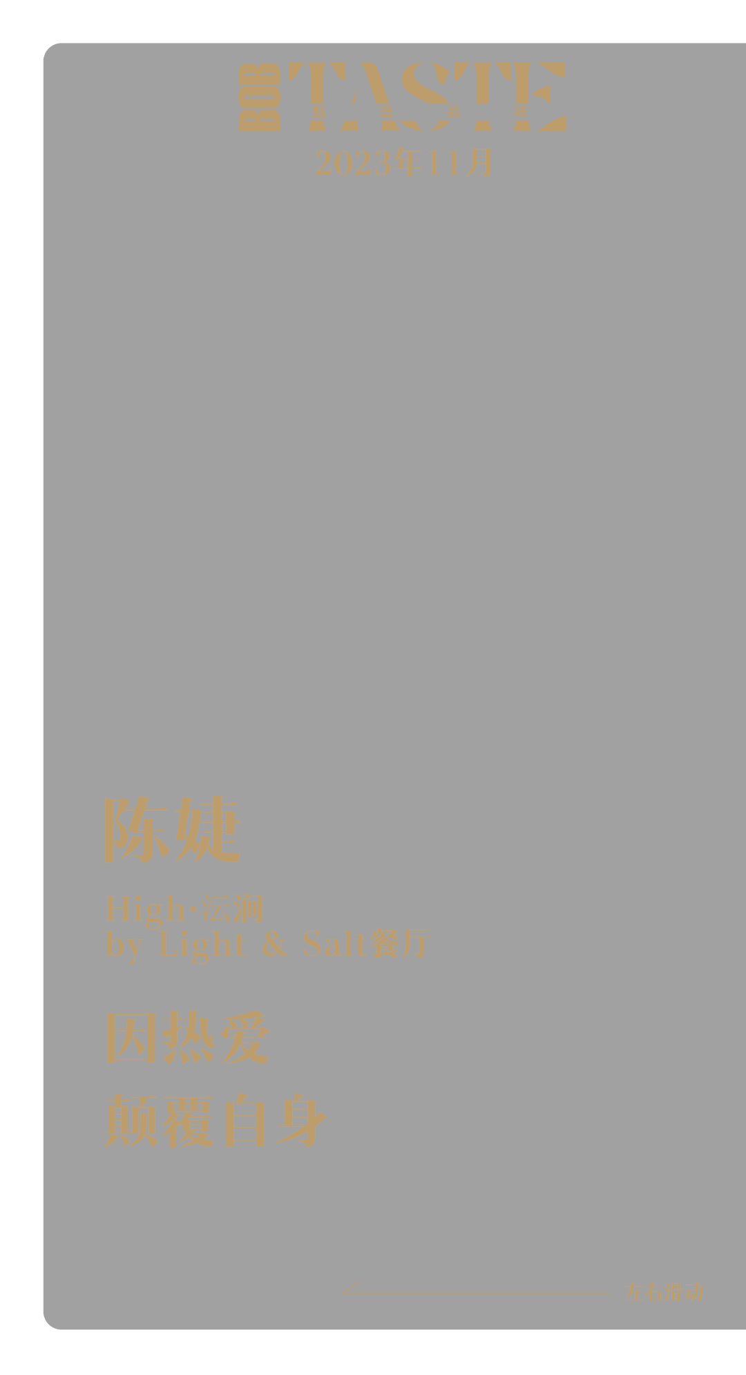 作为上海精致餐饮的代表,High·沄涧 by Light & Salt餐厅在上海美食界久负盛名。其出圈的原因,很大程度上要归功于曾经为昆曲演员和流行歌手的主厨陈婕敏锐地在烹饪中融入艺术的灵感。过去戏曲与流行音乐的训练让她更加注重整套菜单呈现的节奏与情感表达,所以她习惯于在精致餐饮中加入轻快的节奏。似乎对她来说,做菜和做艺术是同一件事情,都出于热爱,会全力以赴对待。