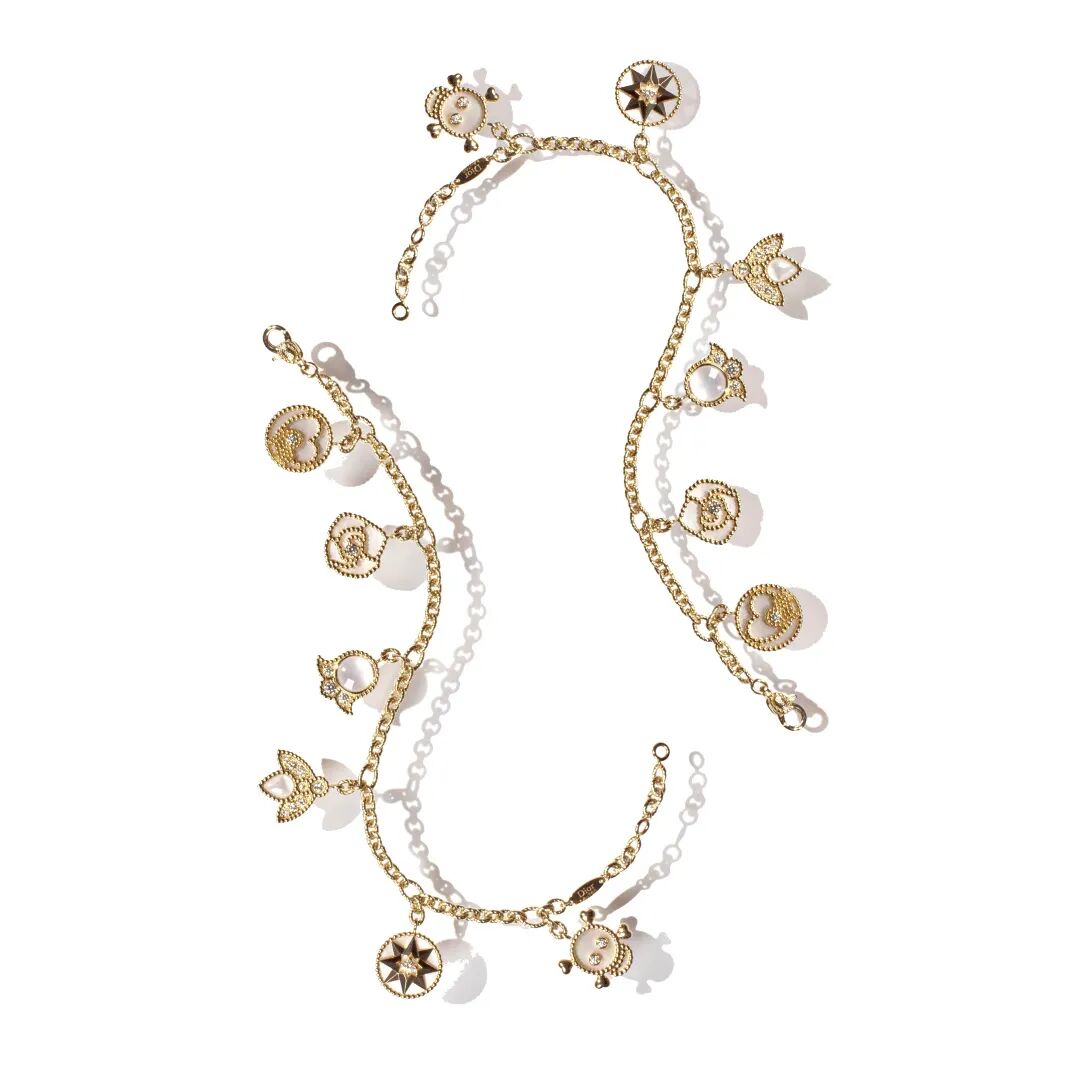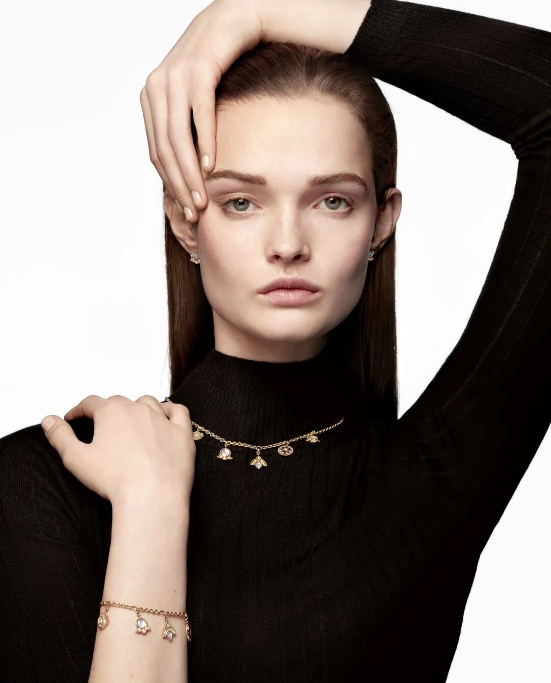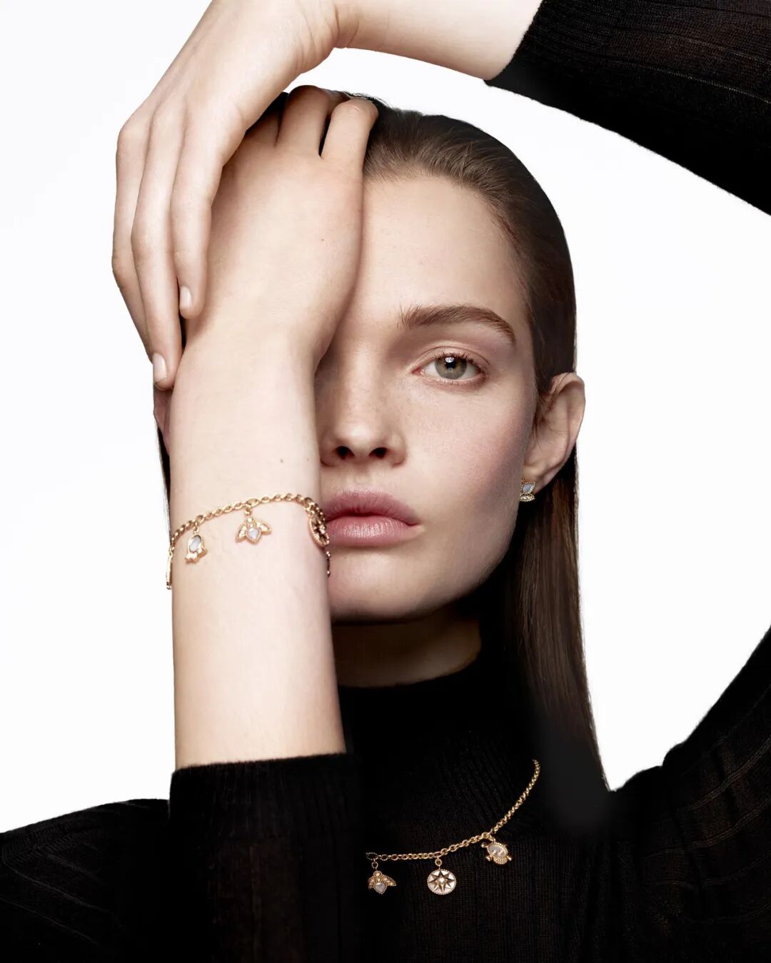 很早之前,Mr. Robb就被DIOR种草了这款“幸运”珠宝。此次,维多利娅携罗盘玫瑰系列全新作品再次启程。黄金珠粒双圈造型耳环由红玉髓、青金石、绿松石及孔雀石错落点缀;ROSE CÉLESTE圆章两面的暖阳与皎月图案在直径25毫米的坠饰之上摇曳生姿,为耳坠与手链注入清新活力;另有三层长项链饰以十六枚罗盘玫瑰,交织出缤纷色调。在黄金珠粒的巧妙勾勒之下,绿色孔雀石、湛蓝色青金石与充满异域情调的绿松石交相辉映;粉色蛋白石、橙色红玉髓与黑色缟玛瑙或金棕色虎眼石相映成趣;白色珍珠母贝雕琢出迪奥先生珍爱的玫瑰、蜜蜂和铃兰——每逢举办时装大秀,迪奥先生总是热衷于将铃兰缝在裙摆上。此外亦有爱心和骷髅图案,它们同罗盘玫瑰一起,将项链与手链化作蕴含守护力量的幸运符;此外,亦有蜜蜂与铃兰单边耳钉,为造型锦上添花,妙趣盎然。