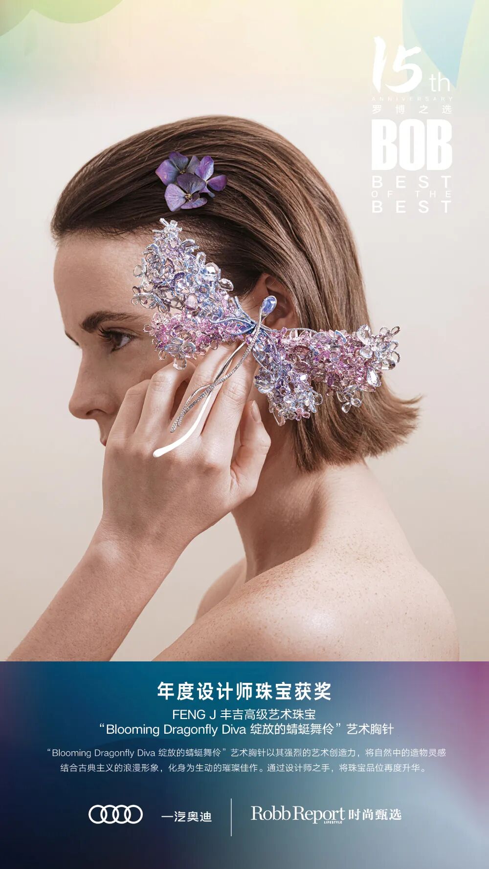在颠覆性的创新与突破中,“Blooming Dragonfly Diva 绽放的蜻蜓舞伶”艺术胸针凝聚着FENG J非凡的艺术格调、对于生命力的细致观察,以及源源不断的创新精神。这种精神令艺术珠宝的魅力一次次“绽放”,散发优雅光芒。