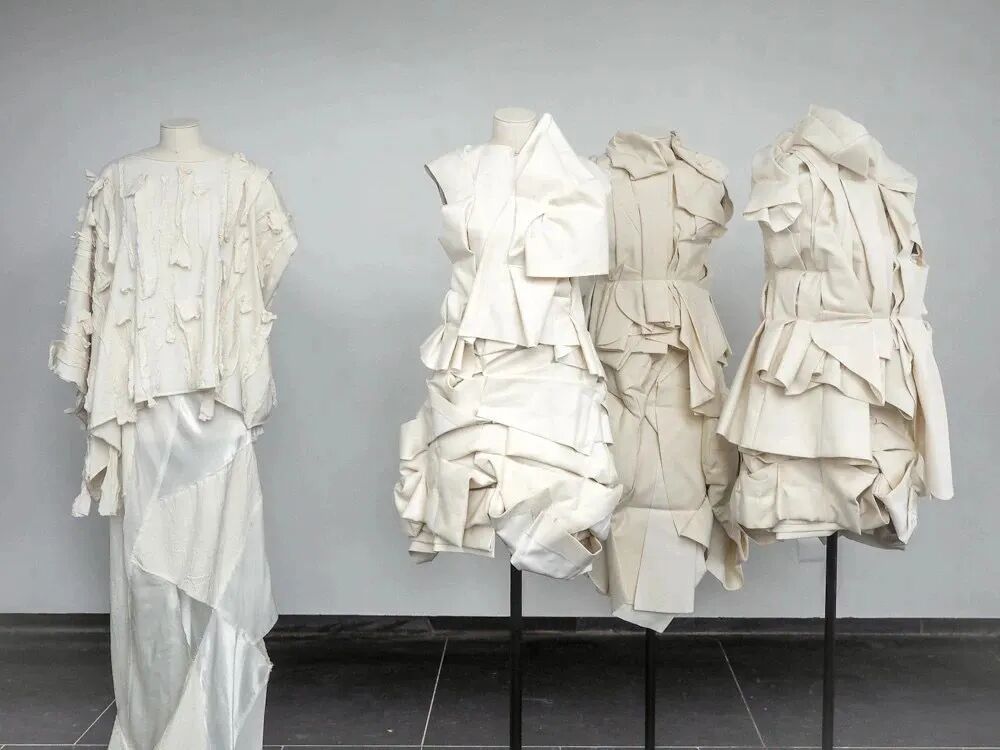 比如将不同面料不同版型不同品类的服装通过裁剪或是叠加组合在一起,有时甚至是将风格差距较大的服装进行重组,比如工装服与西装、毛呢与雪纺等等;或者在设计结构上,多层的袖子、领口、门襟的设计也很常见;还有将衣服剪开,还原成裁片,再制作成全新结构的服装,表现破碎的美感;甚至会将衣服反穿,或是将服装的内里展现出来。将粗糙的立裁工艺保留在服装上,体现一种反叛剪裁的美感。