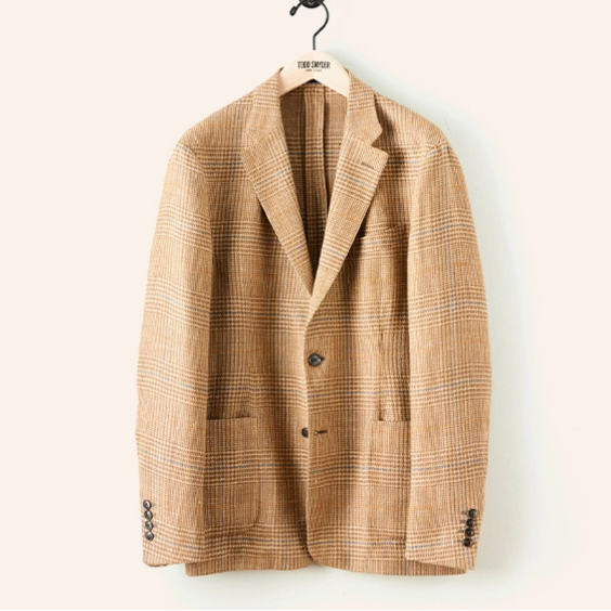 这件Todd Snyder的外套,使你在天气温和的时候仍然可以穿出英式乡村的风格,它由亚麻棉质混合面料制成,带有格纹图案,没有衬垫,也没有内衬。补丁口袋让它足够休闲,可以与牛仔裤搭配,而略微收腰的设计使它看起来更优雅。
