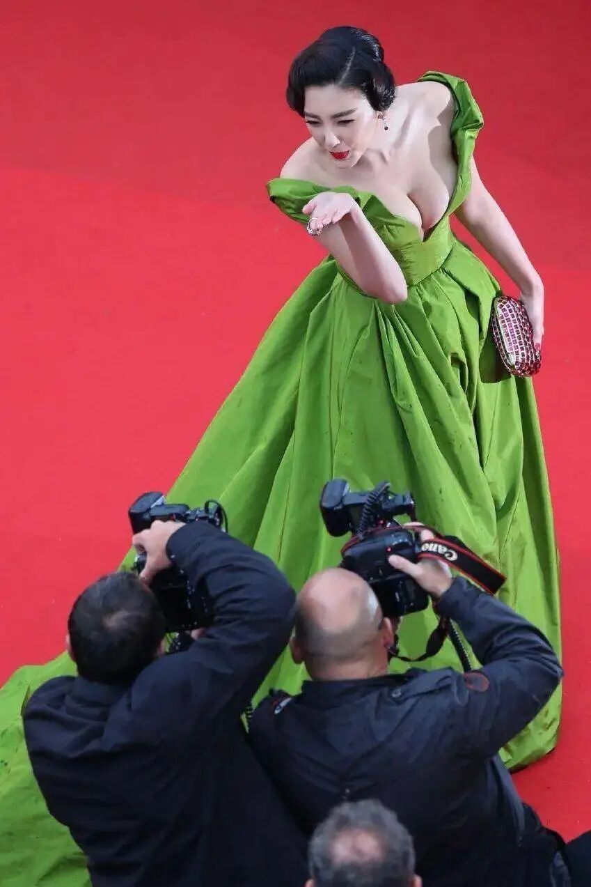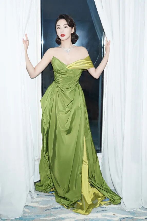 还穿了由一簇苔定制的绿色礼服,致敬2013年自己在戛纳的红毯名场面。