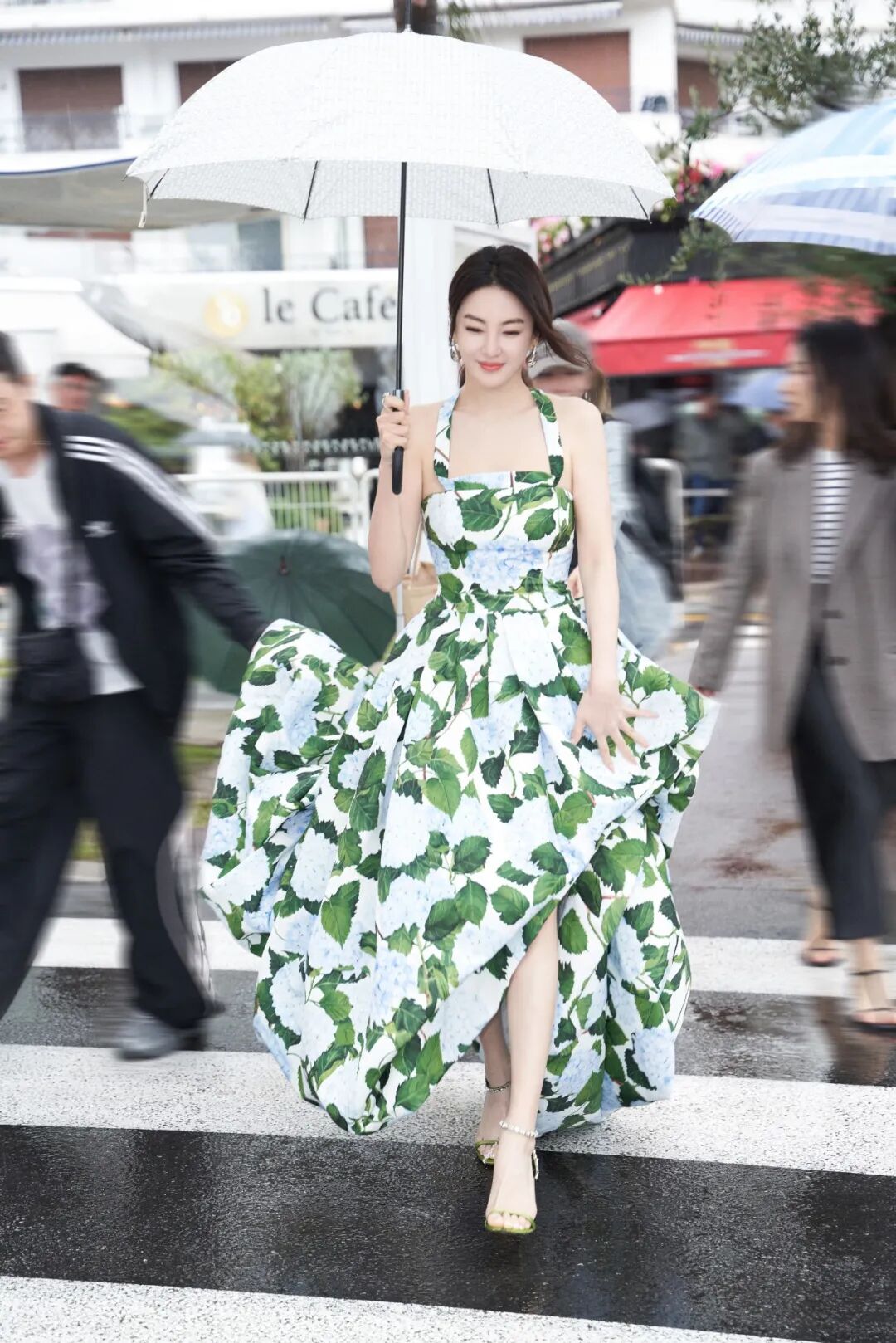 最后她以一袭Oscar de la renta 2023春夏系列的印花裙收官,在雨中撑伞的画面相信会成为新的女明星出圈热图。