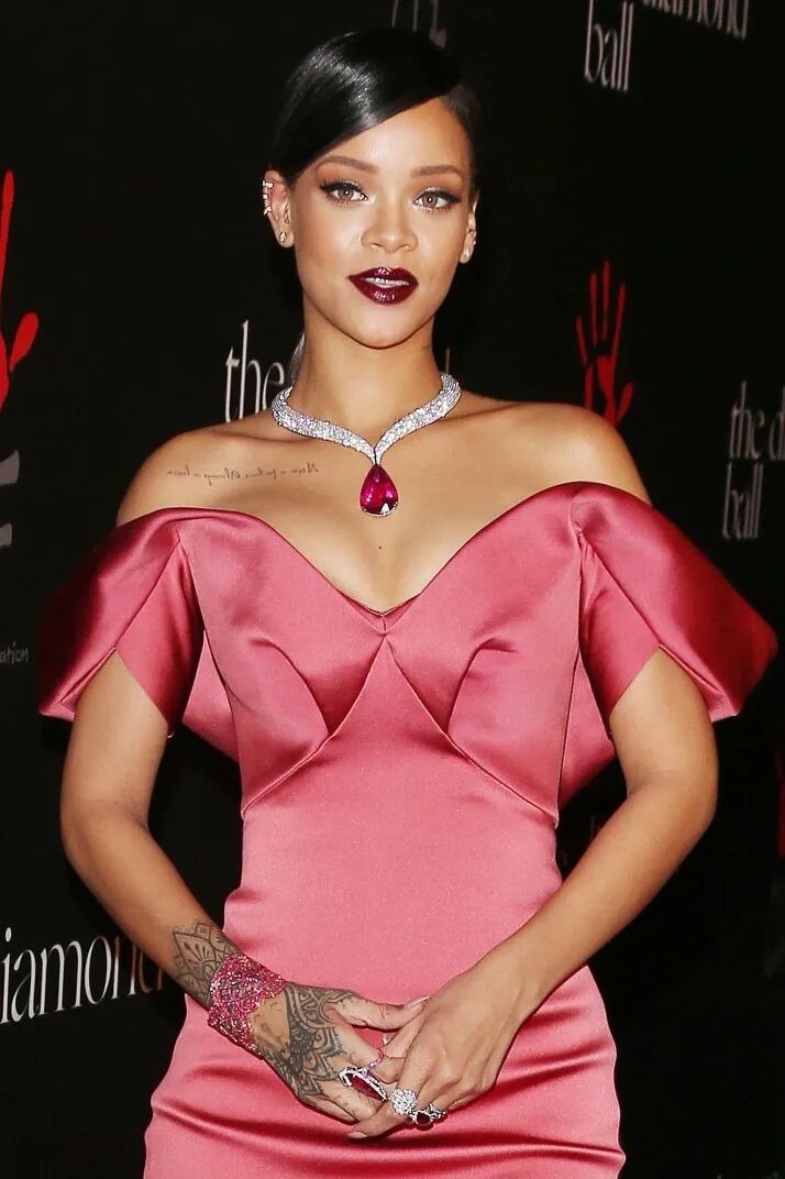 其中Karina佩戴了主石为123克拉红碧玺的古董高珠项链,蕾哈娜在2014年也戴过同款。