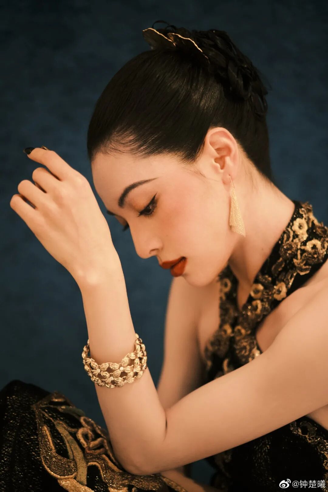 钟楚曦在红毯上走国风路线,穿着来自中国设计师LAURENCE·XU 2013年的作品,黑金改良旗袍上玉兰攀藤缠绕。
