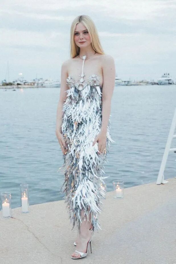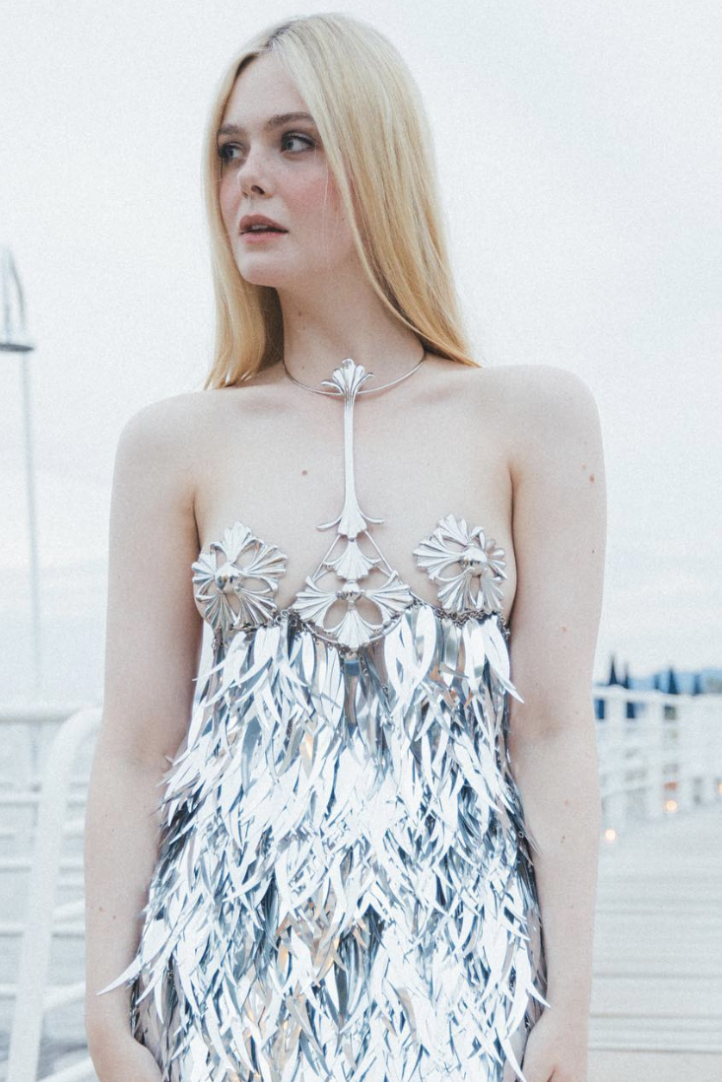 另一位甜妹代表是艾丽·范宁(Elle Fanning),本届戛纳还尝试了更先锋的造型,来自Paco Rabanne 2023秋冬系列,犹如弯刀的金属亮片动起来仿佛是从赛博朋克电影中走出的科幻女战士。