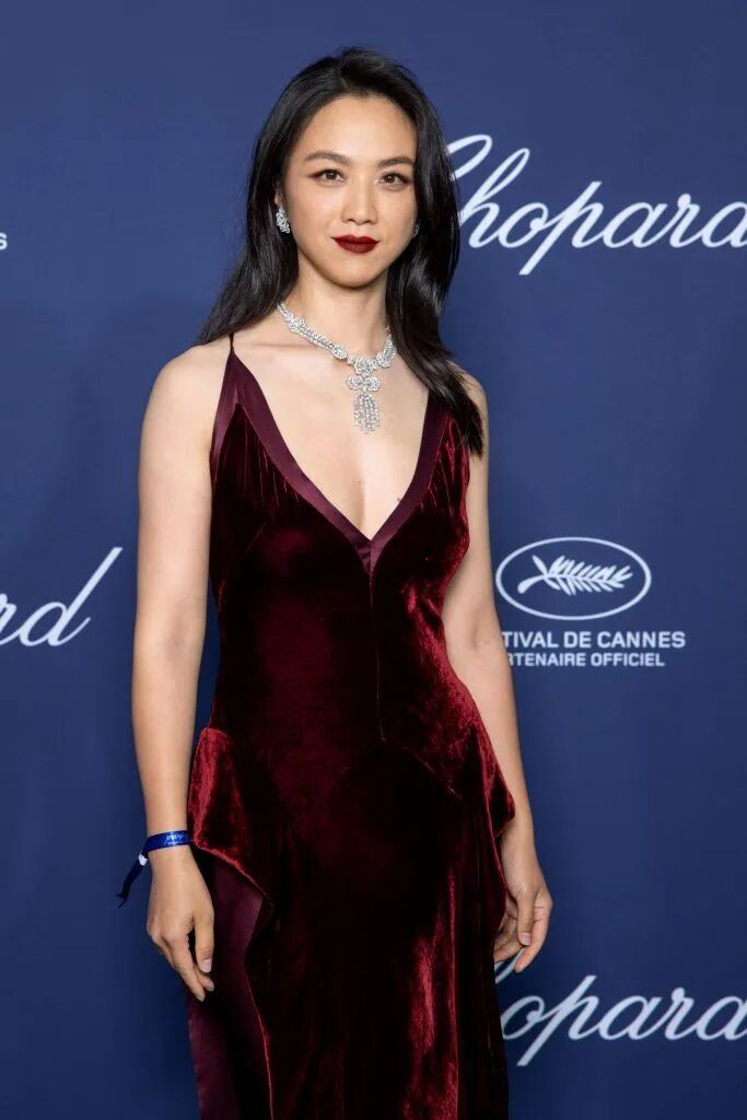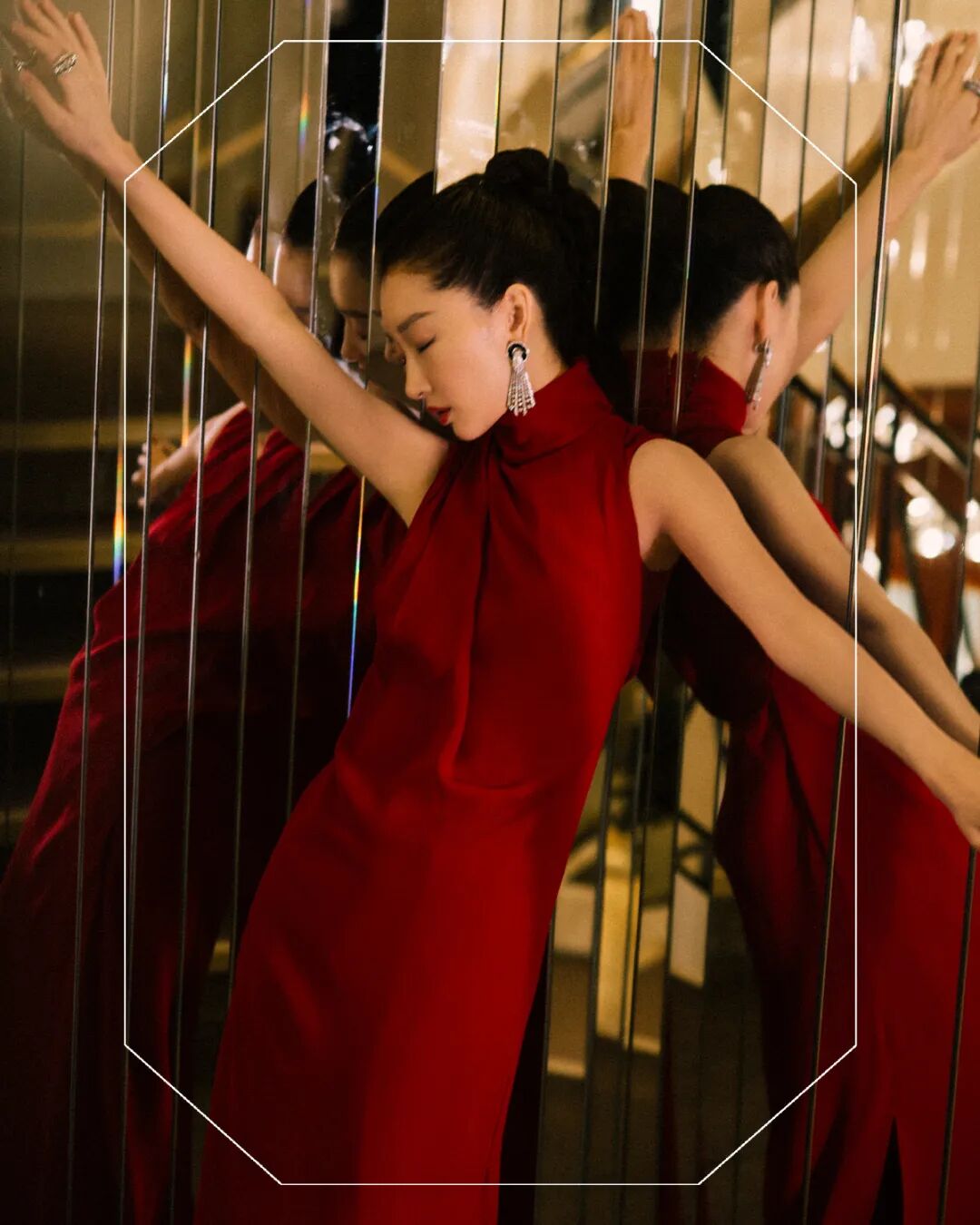 另一套出席萧邦品牌晚宴的造型从公主变身美艳女王,红色丝绒礼服来自Alberta Ferretti 2023秋冬系列。跟深V礼服搭配的珠宝,则选择了萧邦更为灵动浪漫的Precious Lace系列。