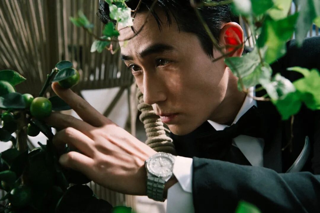 西装低调,搭配的腕表就比较高调了,来自萧邦雪山傲翼系列的满钻腕表奢华闪耀。