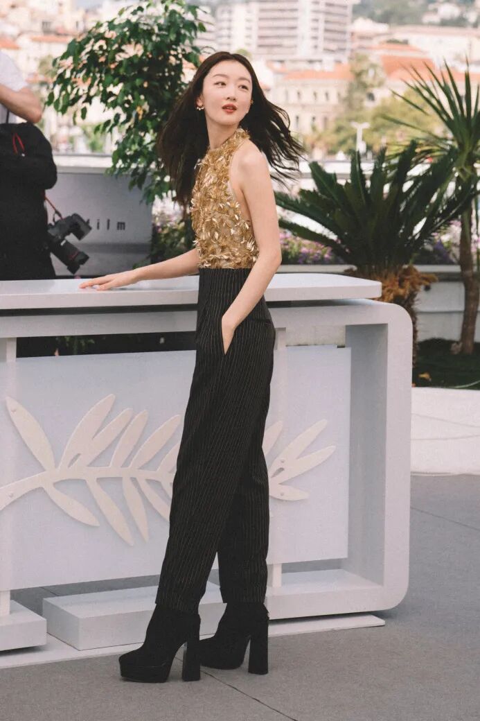 周冬雨戛纳行好评度最高的这身,来自Ralph Lauren 2023早秋系列,裤装造型利落干练,搭配上身的大露背设计,很符合她独特的个人气质。