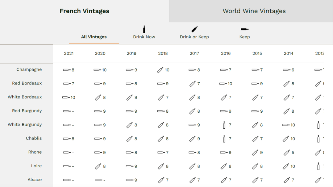 我们向大家介绍的是一些所有人都能获取,并且都能看懂的渠道,那就是英国百年酒商贝瑞兄弟与路德(Berry Bros. & Rudd,BBR)准备的年份指南,在其官网即可查看。作为酒商,BBR将年份和陈年简化到了一定程度,特别为美酒爱好者着想。简单的产区分类(包含香槟、勃艮第红、勃艮第白、波尔多和隆河,以及诸多世界产区),明确的适饮(drink)、适饮或陈年(drink or keep)以及陈年(keep)标识都是它的优势所在。