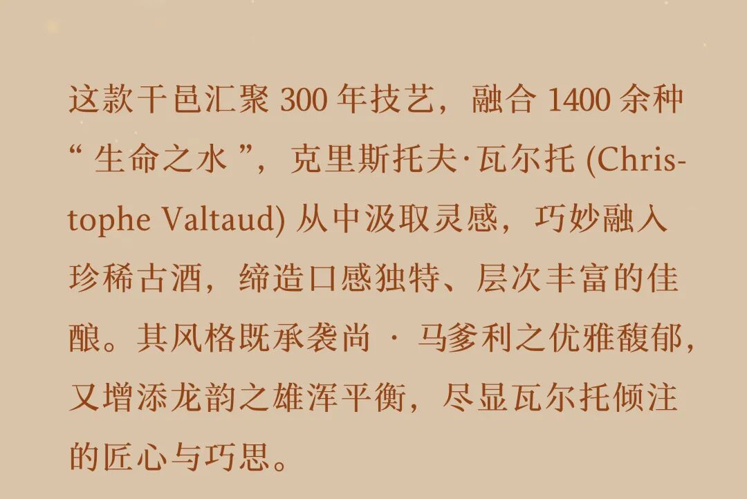 如金琥珀色的液体略带红褐色调。初闻时是清新的花香开场,并巧妙地融入了馥郁的莲子和龙眼等蜜饯水果和干果的香气。中国桂皮、四川花椒等香料的辛香,以及雪松和檀木等高级木材的清香赋予了酒体格外温暖的芬芳。入口是蜜饯和干果的馥郁,随之而来的是莓果的香甜,同时伴有丝丝缕缕的香料和老檀木的暖意。余味婉转悠长,齿颊留香,令人不禁联想起龙之永生不朽。